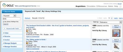 I recently asked one of the developers how they got started. “The easiest thing for us to do was introduce ‘gesture-based’ searching in the staff interface,” said Kannan Seshadri, Release Manager for the product. Usability testers had a blast finding titles on peace, prayer, and The Fonz. Rock, paper, and scissors also became popular search terms, but nothing surpassed the number of searches for “birds” in WorldCat that day.